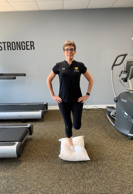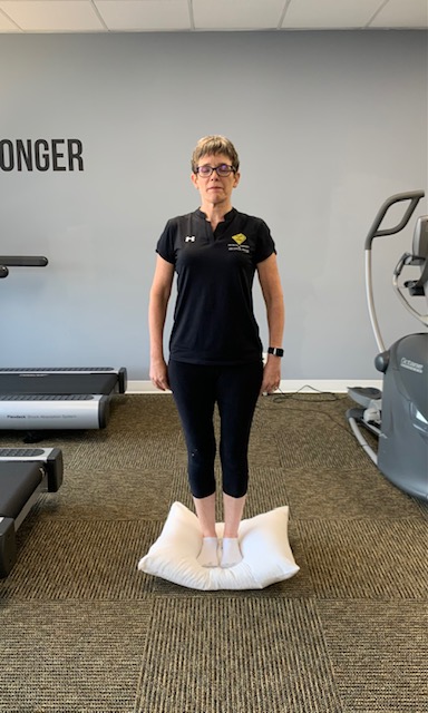 4) SINGLE LEG STANDING ON AN UNLEVEL SURFACE (PILLOW) Once you can safely manage 30 continuous seconds on a level surface, challenge yourself by attempting an unlevel surface such as a pillow. Work up to 30 continuous seconds of single-leg standing.